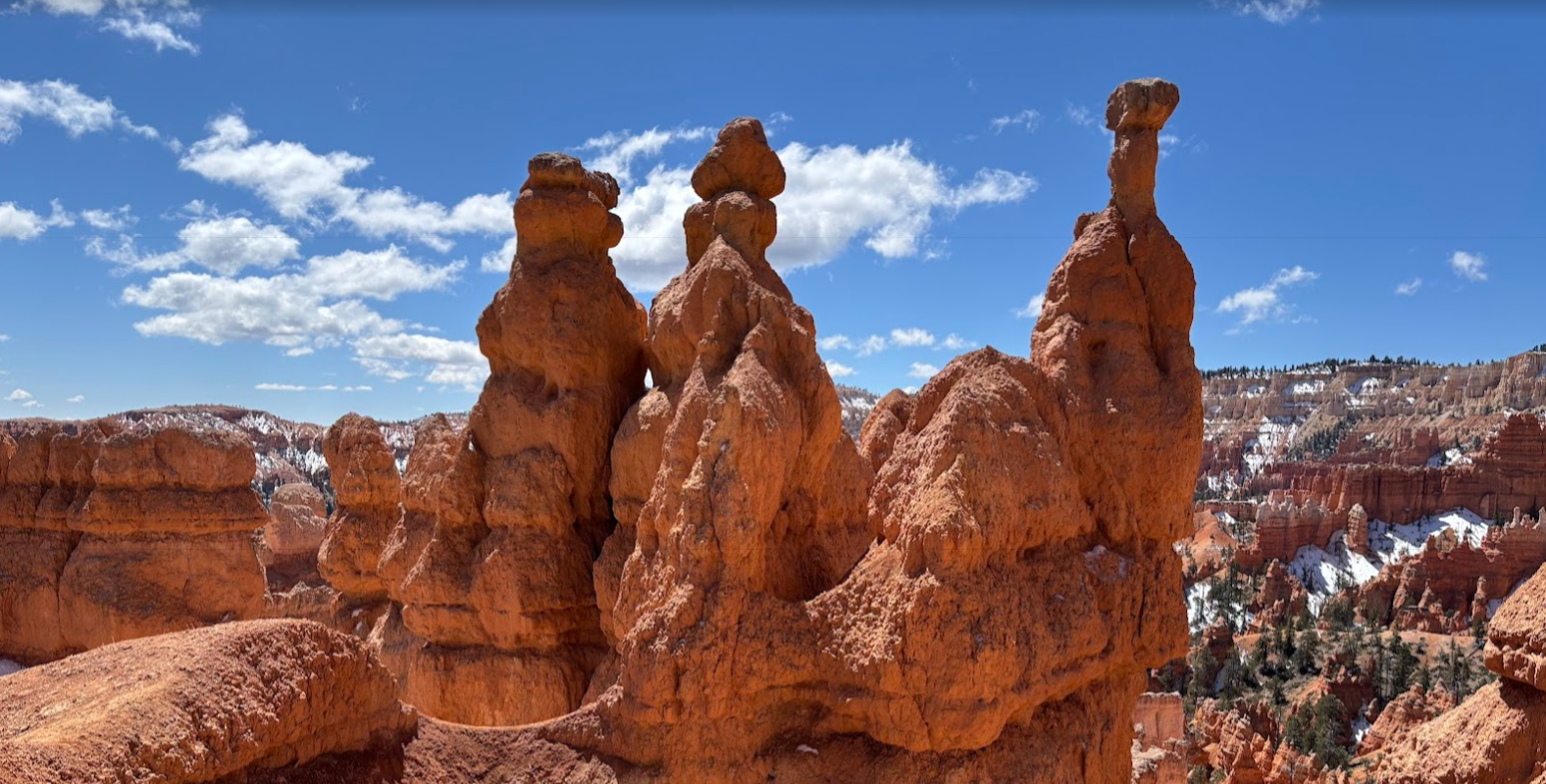 Kanion Bryce to rozległy amfiteatr, którego dno znajduje się ok. 400-600m poniżej górnego brzegu. Hoodoos wyrastają ponad nami, a my nagle znajdujemy się w rzadkim lesie iglastym.