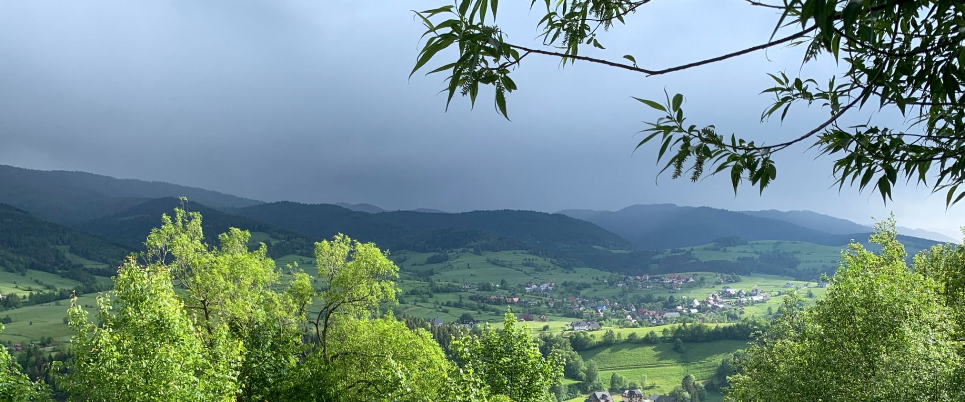 Schodząc z Jasienia zielonym szlakiem do Lubomierza, na polanie Łąki, widzimy Królową Beskidów w całej okazałości. Skomentowałem grupce, że jeśli w czasie wyprawy widzę Babią Górę, to wycieczka jest udana. Polana Łąki, z widokiem na Babią Górę jest rewelacyjnym miejscem na podziwianie zachodu słońca. Ale nie tym razem. Czarne chmury skłaniają nas do zejścia do Lubomierza.
