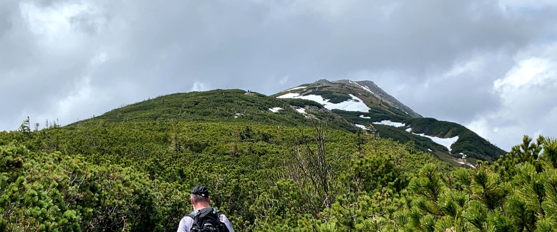 Między schroniskiem a przełęczą Brona jest sporo śniegu, miejscami zlodowaciałego (data: 15 maja 2021). Dajemy radę, ja z kijkami, reszta bez. Ale na zejście tym fragmentem założymy raczki.