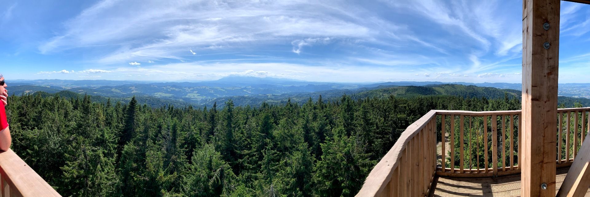 Wchodzę na wieżę – nawet nie pomyślałem o zdjęciu plecaka – i daję sobie czas na kontemplowanie widoków i nazywanie pasm i szczytów. Mam czas – do schroniska na Przehybie jeszcze około godziny, a jest wczesne popołudnie. Co mnie skłania do przerwania kontemplacji to woda – a w zasadzie jej brak. W upalny dzień prawie cały zapas wypiłem, a po drodze nie było źródełek. Od Rytra nie było też żadnej ‘cywilizacji’ i możliwości zakupu. Wodopój będzie dopiero w schronisku. No cóż, trzeba zejść i dreptać dalej.