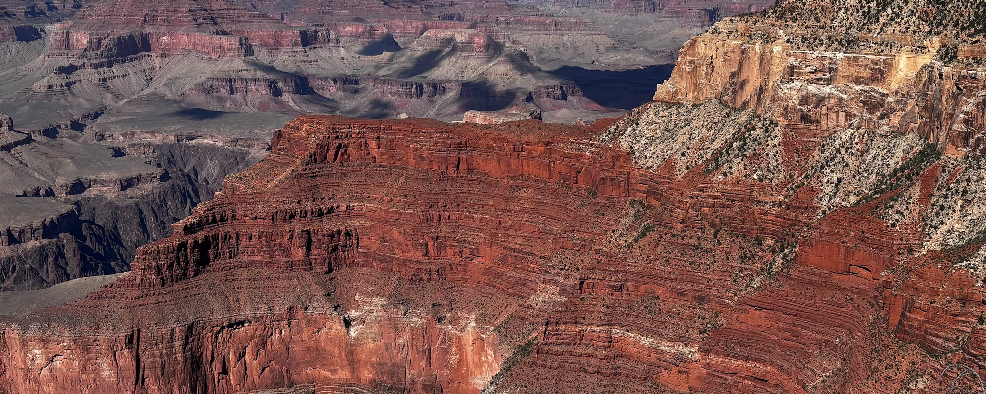 The Grand Canyon is over 1.5km deep. There haven't been any serious mountain shaping movements. Therefore the rock layers are neatly placed one on top of another. Water (Colorado river and its tributaries, but also precipitation) has sculpted deep gaps in the rock, uncovering subsequent, parallel layers. The walls of the canyon are not a single drop. They are steep indeed, but in many places we see flat terraces.