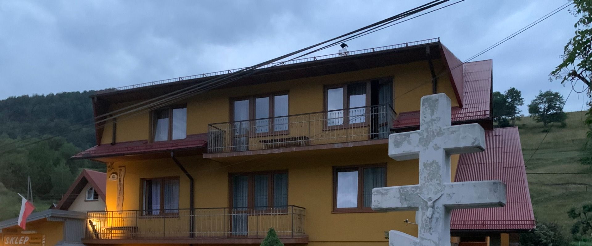 Krzyż przed naszą bazą został postawiony w 1937r. przez łemkowskich gospodarzy domostwa stojącego na miejscu domu pana Jana. Są dwie wersje - jedna to wotum wdzięczności za uratowanie od powodzi, druga - za urodzenie 2 zdrowych córek po tym jak wcześniej zmarło troje dzieci. Niezależnie od wersji - krzyż jest solidny, waży 10 ton, zrobiony jest z zbrojonego betonu. Co znaczy, że łemkowscy gospodarze musieli się na niego wykosztować. Po wojnie krzyż został przewrócony przez wezbraną rzekę i długo leżał w krzakach. Rodzina pana Jana ocaliła krzyż przed zapomnieniem i postawili go na jego pierwotnym miejscu.