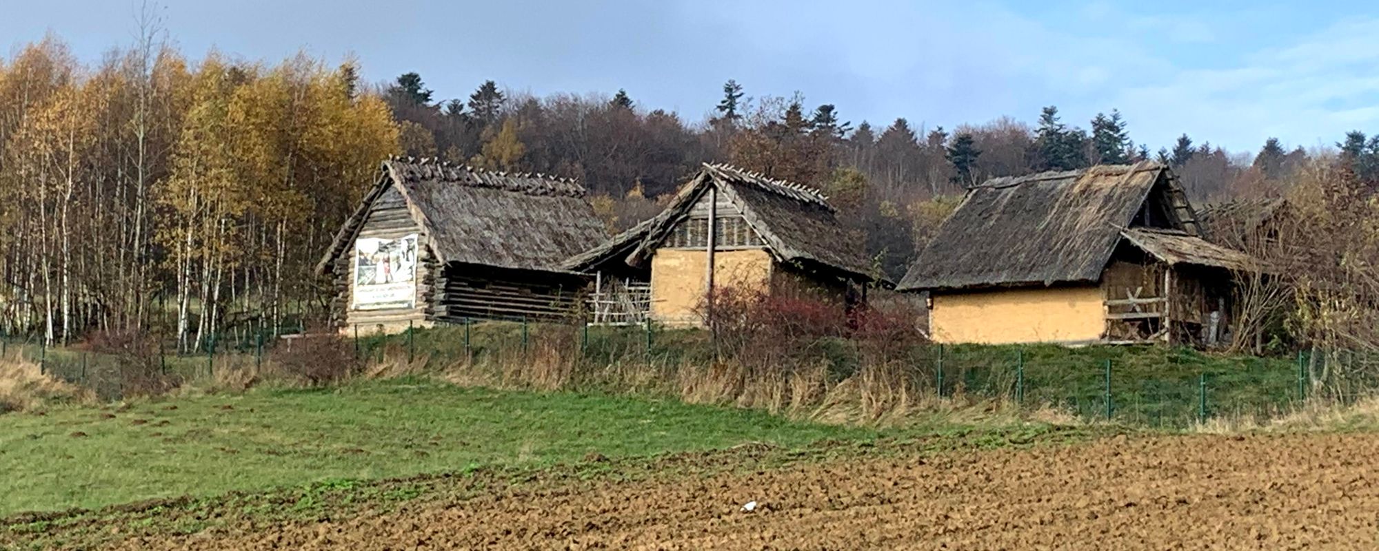Fragment szlaku po Hucie Szklanej jest niezwykle przyjemny. Idziemy skrajem rzadkiego lasu, prawie nie spotykamy innych turystów, a po naszej lewej dziwnie zielone, jak na listopad, łąki oraz pola i zabudowania. Bardzo sielski krajobraz, dodatkowo podświetlany przez słońce.