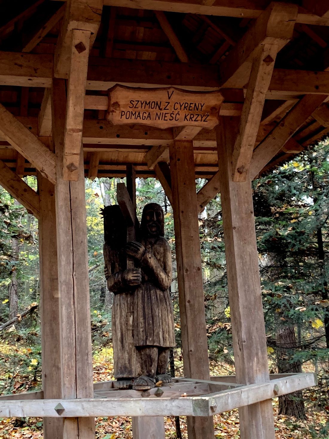 Podejście urozmaicają stacje Drogi Krzyżowej z rzeźbionymi w drewnie scenami. Wiele jest wyrzeźbionych w jednym kawałku drewna. Styl jest prosty, wręcz surowy.