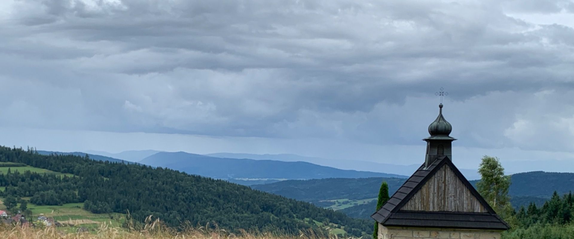 Całe zejście z Koskowej Góry do Jordanowa było deszczowo-mżawkowe. Ale na koniec na zachodzie pokazało się słońce, które pięknie oświetliło pasmo Polic. Kolejny dzień zacznie się pochmurnie, a potem już tylko słońce. Dopiero w ostatni dzień wędrówki ponownie wyciągnę pelerynę.