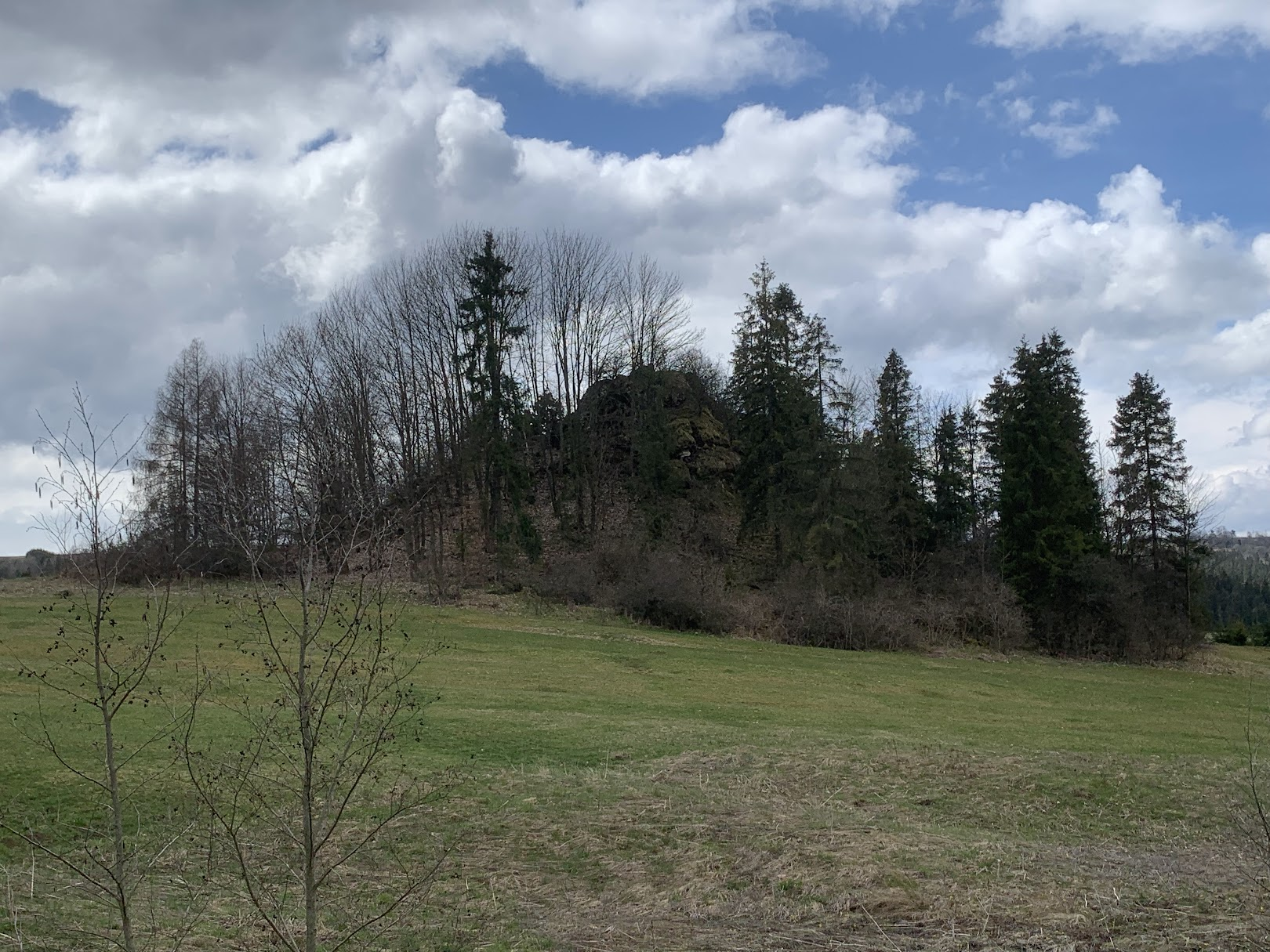 Szlak nie prowadzi "od skałki do skałki". Widać wyraźnie wybrzuszenia w terenie, ale niektóre są zalesione i skałkę trzeba sobie znaleźć. Najciekawsze na naszej trasie były Gęśle - samotna skała, widoczna z daleka. Podobnie uważał napotkany tam amator wspinaczki skałkowej. Skałki nie są objęte ochroną rezerwatową.