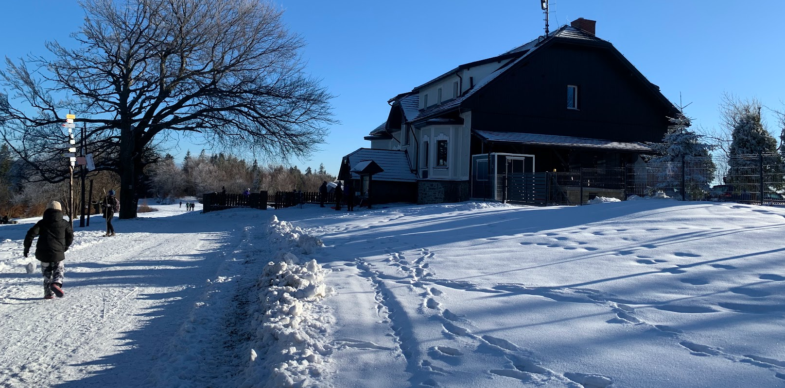 Ze stacji Łodygowice wychodzą dwa szlaki turystyczne. My idziemy czerwonym na Czupel. Zielonym można dojść do Czernichowa. Pogodę mamy bardzo dobrą - lekki mrozik, bezwietrznie. Rano widać trochę chmur, ale w ciągu godzin wszystkie znikną i przez większość wędrówki będziemy mieli niebo cudownie błękitne.