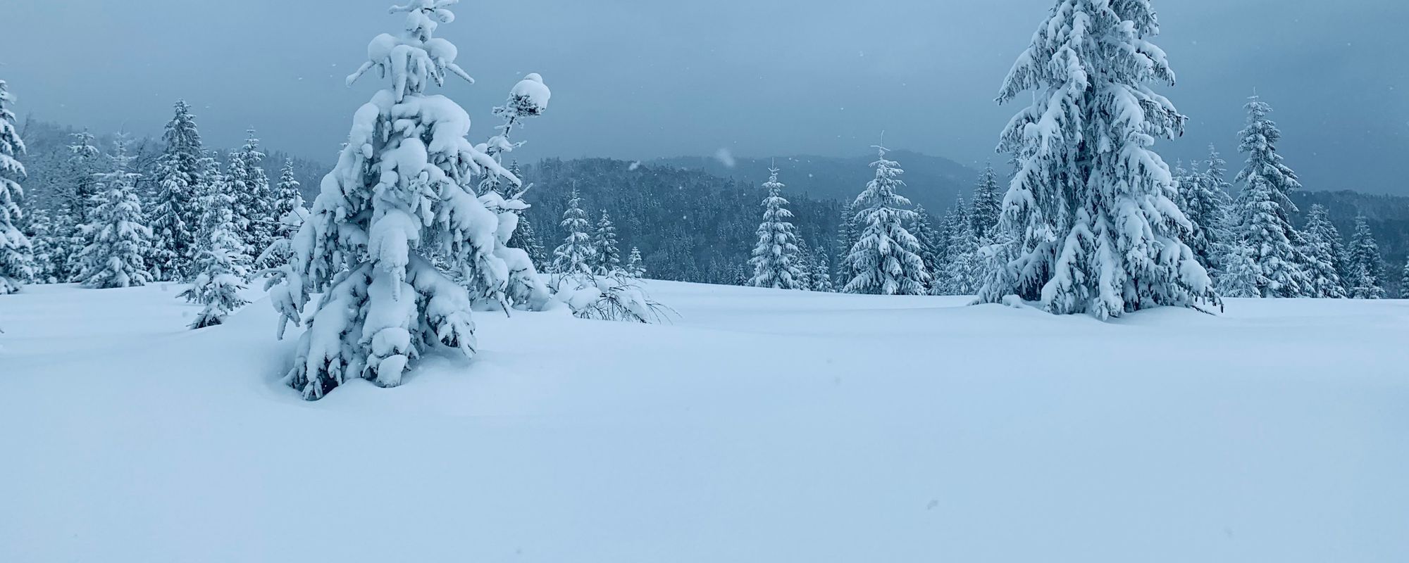Na Hali Długiej spotkała nas pogodowa niespodzianka. Z jednej strony uderzył w nas przenikliwy wiatr, którego wcześniej nie czuliśmy. Tego akurat można było się spodziewać po wyjściu spod osłony lasu. Ale słońca w pochmurny dzień nie spodziewaliśmy. Wyszło na ok. 15 minut i nasz czarno-biały świat roziskrzył się srebrem śniegu. Zdjęcia z błękitem zimowego nieba są diametralnie różne od tych wcześniejszych.