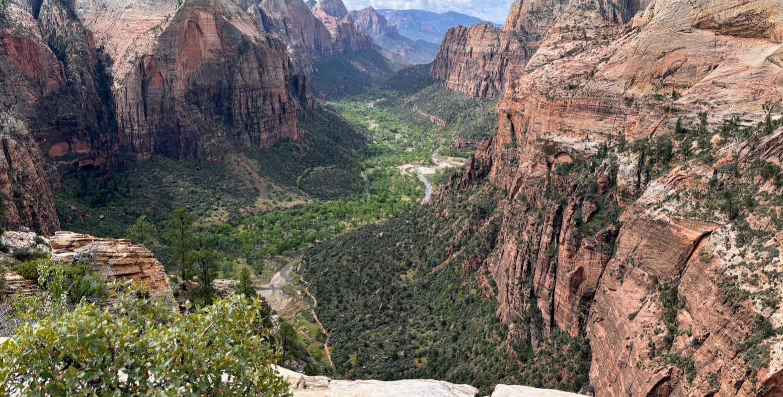 It's worth the effort. Even though we are not at the highest point of the park, the view is dramatic. Angels Landing extends into the valley and its northern wall is a 450m sheer vertical drop into the valley.