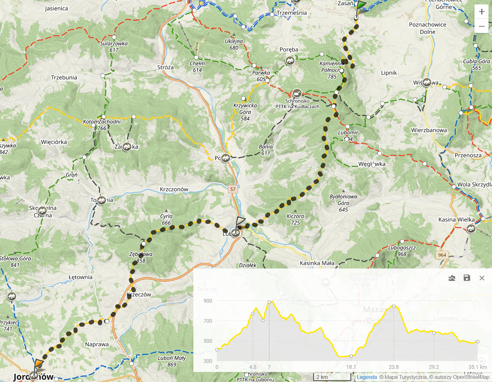 Żółty szlak Wieliczka - pod Beskidami. Dzień 2: Zasań - Jordanów (35,1km, 1415m podejść)